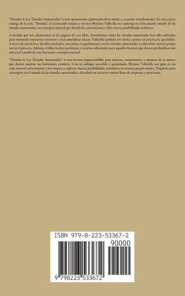 "Tétradas 4: Las Tétradas Aumentadas" es una apasionante exploración de la música y su poder transformador. En esta cuarta entrega de la serie "Tétradas", el reconocido músico y escritor Brynner Vallecilla nos sumerge en el fascinante mundo de las tétradas aumentadas, un concepto musical que desafía las convenciones y abre nuevas posibilidades artísticas. A medida que nos adentramos en las páginas de este libro, descubrimos cómo las tétradas aumentadas han sido utilizadas para transmitir emociones intensas y crear atmósferas únicas. Vallecilla también nos invita a poner en práctica lo aprendido. A través de ejercicios y desafíos musicales, nos anima a experimentar con las tétradas aumentadas y a descubrir nuestra propia voz en el proceso. Además, el libro incluye partituras y recursos adicionales para aquellos lectores que deseen profundizar aún más en el estudio de este fascinante concepto musical. "Tétradas 4: Las Tétradas Aumentadas" es una lectura imprescindible para músicos, compositores y amantes de la música que deseen ampliar sus horizontes creativos. Con su enfoque accesible y apasionado, Brynner Vallecilla nos guía en un viaje musical emocionante y nos inspira a explorar nuevas posibilidades armónicas en nuestra propia música. Prepárate para sumergirte en el mundo de las tétradas aumentadas y descubrir un universo sonoro lleno de sorpresas y emociones.