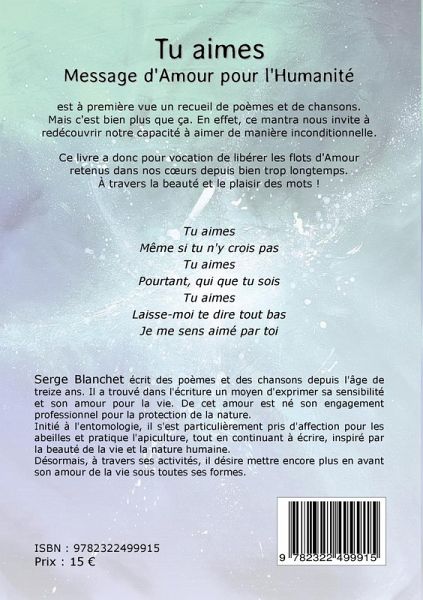 "Tu aimes - Message d'Amour pour l'Humanité" est à première vue un recueil de poèmes et de chansons. Mais c'est bien plus que ça.En effet, ce mantra nous invite à redécouvrir notre capacité à aimer de manière inconditionnelle.Ce livre a donc pour vocation de libérer les flots d'Amour retenus dans nos coeurs depuis bien trop longtemps.A travers la beauté et le plaisir des mots !