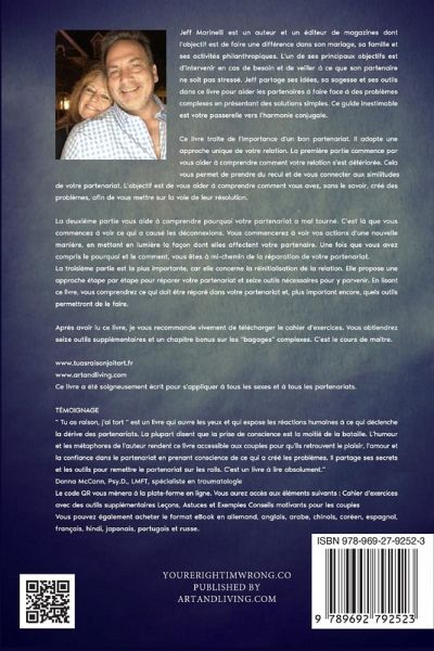 ¿¿ TÉMOIGNAGE Tu as raison, j'ai tort " est un livre qui ouvre les yeux et qui expose les réactions humaines à ce qui déclenche la dérive des partenariats. La plupart disent que la prise de conscience est la moitié de la bataille. L'humour et les métaphores de l'auteur rendent ce livre accessible aux couples pour qu'ils retrouvent le plaisir, l'amour et la confiance dans le partenariat en prenant conscience de ce qui a créé les problèmes. Il partage ses secrets et les outils pour remettre le partenariat sur les rails. C'est un livre à lire absolument. Donna McCann, Psy.D., LMFT, spécialiste en traumatologie