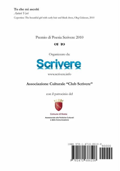 In questo volume sono pubblicate tutte le opere che hanno partecipato al Premio di Poesia Scrivere 2010, organizzato dalla Associazione Culturale "Club Scrivere" e dal sito di poesie "Scrivere" (www.scrivere.info) con il patrocinio dell'Assessorato alle Politiche Culturali e della Comunicazione del Comune di Roma. "Tu che mi ascolti": Primo premio: E tu l'ascolti di Carmelo Sanfilippo, Secondo premio: Candida di Stefano Toschi, Terzo premio: Le ore e l'amore di Angelo Ricotta. "Poesia a tema libero": Primo premio: Dove stai di te di Antonio Biancolillo, Secondo premio: Luna d'Agosto di SanziE, Terzo Premio: Sei vecchio! di Franco Petrone, "Ricco non è colui che possiede, ma colui che dà, colui che è capace di dare" Giovanni Paolo II (Karol Wojtyla): Primo premio Chiuse tasche di Nadia De Stefano, Secondo premio: Poesia di un dono di Costante Mariani, Terzo Premio: Quel che ho di Lina Siriani, "Violenza sulle donne": Primo premio: La donna della porta accanto... di Cinzia Pallucchini.