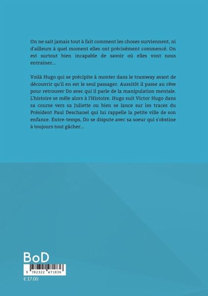 On ne sait jamais tout à fait comment les choses surviennent, ni d'ailleurs à quel moment elles ont précisément commencé. On est surtout bien incapable de savoir où elles vont nous entrainer... Voilà Hugo qui se précipite à monter dans le tramway avant de découvrir qu'il en est le seul passager. Aussitôt il passe au rêve pour retrouver Do avec qui il parle de la manipulation mentale. L'histoire se mêle alors à l'Histoire. Hugo suit Victor Hugo dans sa course vers sa Juliette ou bien se lance sur les traces du Président Paul Deschanel qui lui rappelle la petite ville de son enfance. Entre-temps, Do se dispute avec sa soeur qui s'obstine à toujours tout gâcher...