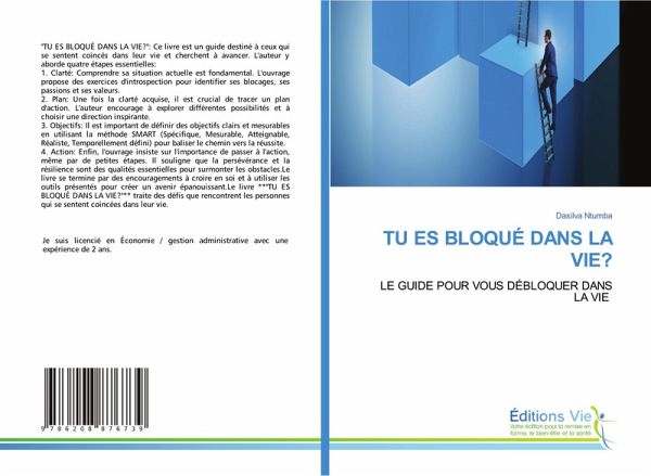 "TU ES BLOQUÉ DANS LA VIE?": Ce livre est un guide destiné à ceux qui se sentent coincés dans leur vie et cherchent à avancer. L'auteur y aborde quatre étapes essentielles:1. Clarté: Comprendre sa situation actuelle est fondamental. L'ouvrage propose des exercices d'introspection pour identifier ses blocages, ses passions et ses valeurs.2. Plan: Une fois la clarté acquise, il est crucial de tracer un plan d'action. L'auteur encourage à explorer différentes possibilités et à choisir une direction inspirante.3. Objectifs: Il est important de définir des objectifs clairs et mesurables en utilisant la méthode SMART (Spécifique, Mesurable, Atteignable, Réaliste, Temporellement défini) pour baliser le chemin vers la réussite.4. Action: Enfin, l'ouvrage insiste sur l'importance de passer à l'action, même par de petites étapes. Il souligne que la persévérance et la résilience sont des qualités essentielles pour surmonter les obstacles.Le livre se termine par des encouragements à croire en soi et à utiliser les outils présentés pour créer un avenir épanouissant.Le livre **"TU ES BLOQUÉ DANS LA VIE?"** traite des défis que rencontrent les personnes qui se sentent coincées dans leur vie.
