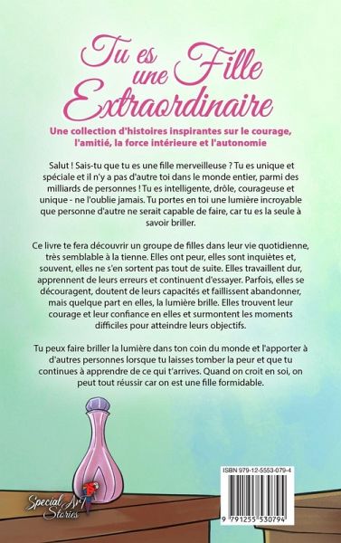Salut ! Sais-tu que tu es une fille merveilleuse ? Tu es unique et spéciale et il n'y a pas d'autre toi dans le monde entier, parmi des milliards de personnes ! Tu es intelligente, drôle, courageuse et unique - ne l'oublie jamais. Tu portes en toi une lumière incroyable que personne d'autre ne serait capable de faire, car tu es la seule à savoir briller. Ce livre te fera découvrir un groupe de filles dans leur vie quotidienne, très semblable à la tienne. Elles ont peur, elles sont inquiètes et, souvent, elles ne s'en sortent pas tout de suite. Elles travaillent dur, apprennent de leurs erreurs et continuent d'essayer. Parfois, elles se découragent, doutent de leurs capacités et faillissent abandonner, mais quelque part en elles, la lumière brille. Elles trouvent leur courage et leur confiance en elles et surmontent les moments difficiles pour atteindre leurs objectifs. Tu peux faire briller la lumière dans ton coin du monde et l'apporter à d'autres personnes lorsque tu laisses tomber la peur et que tu continues à apprendre de ce qui t'arrives. Quand on croit en soi, on peut tout réussir car on est une fille formidable. Ce que tu trouveras dans ce livre: 10 histoires inspirantes pour les filles sur ""l'estime de soi, le courage, la force intérieure et l'amour de soi"". Un style d'écriture simple et engageant, adapté à la lecture partagée et indépendante. Identification avec les personnages qui sont toujours associés à des thèmes de la vie réelle des enfants. De belles images pour accompagner la lecture et stimuler l'imagination Morales et messages de la vie avec réflexions et implication dans le récit Les filles adorent ce livre car il les aide à: Développer leur confiance en soi et en leurs capacités Vaincre la timidité et l'anxiété Mieux faire face aux situations difficiles Surmonter leurs peurs et être courageuses Ne jamais abandonner et à ne pas se laisser décourager par les petits échec Croire en leurs rêves Comprendre l'importance des relations avec leurs parents et leurs amis Être curieuse et suivre leurs passions 2 Cadeaux pour toi que tu peux télécharger sur le site de Special Art: Journal des rêves des enfants (PDF) Phrases de coloriage motivantes pour les enfants (PDF) Cliquez sur ""acheter maintenant"" et aide une fille à ne jamais cesser de rêver et de croire en elle ! (Une idée de cadeau parfaite)