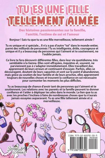 Bonjour ! Sais-tu que tu es une fille merveilleuse, tellement aimée ? Tu es unique et si spéciale... Il n'y a pas d'autre "toi" dans le monde entier, parmi des milliards de personnes ! Tu es intelligente, drôle, courageuse et unique et il y a beaucoup de personnes qui t'aiment et te soutiennent, ne l'oublie jamais. Ce livre te fera découvrir différentes filles, dans leur vie quotidienne, très semblable à la tienne. Elles sont effrayées, inquiètes et, souvent, ne parviennent pas à s'adapter immédiatement. Elles travaillent dur, apprennent de leurs erreurs et continuent d'essayer. Parfois, elles se découragent, doutent de leurs capacités et sont sur le point d'abandonner, mais grâce au soutien de leur famille et de leurs proches, elles apprennent toujours de nouvelles choses et trouvent la confiance en soi nécessaire pour surmonter les moments les plus difficiles. Tu as beaucoup de chance d'avoir tant de personnes qui t'aiment et te soutiennent. Les relations avec tes parents et ta famille peuvent te donner confiance et t'aider à déployer tes ailes dans le monde. Le lien que tu as avec tes proches t'incitera à faire de nombreuses choses que tu n'aurais jamais essayées auparavant. Tu es une fille tellement aimée et si merveilleuse. Ce que tu trouveras dans ce livre: 10 histoires inspirantes pour les filles sur la famille, l'amitié, l'estime de soi et l'amour Un style d'écriture simple et engageant, adapté à la lecture partagée et indépendante. Identification avec les personnages qui sont toujours associés à des thèmes de la vie réelle des enfants. De belles images pour accompagner la lecture et stimuler l'imagination Morales et messages de la vie avec réflexions et implication dans le récit Les filles adorent ce livre car il les aide à: Comprendre l'importance des relations avec leurs parents et leurs amis Développer leur confiance en soi et en leurs capacités Mieux faire face aux situations difficiles Ne jamais abandonner et à ne pas se laisser décourager par les petits échec Être curieuse et suivre leurs passions 2 Cadeaux pour toi que tu peux télécharger sur le site de Special Art: Journal des rêves des enfants (PDF) Phrases de coloriage motivantes pour les enfants (PDF) Cliquez sur "acheter maintenant" et aide une fille à améliorer son estime de soi et à croire en elle ! (Une idée de cadeau parfaite)