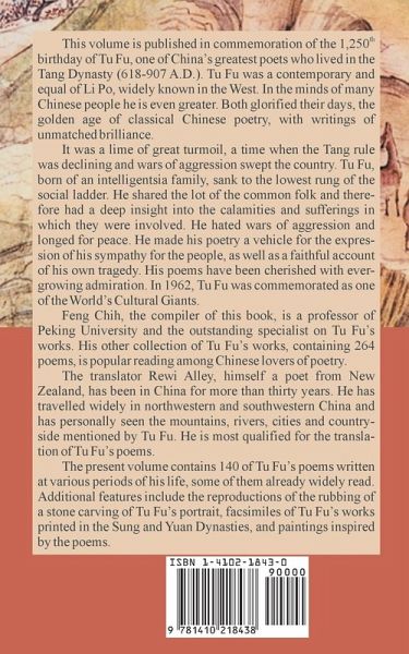 This volume is published in commemoration of the 1,250th birthday of Tu Fu, one of China's greatest poets who lived in the Tang Dynasty (618-907 A.D.). Tu Fu was a contemporary and equal of Li Po, widely known in the West. In the minds of many Chinese people he is even greater. Both glorified their days, the golden age of classical Chinese poetry, with writings of unmatched brilliance. It was a lime of great turmoil, a time when the Tang rule was declining and wars of aggression swept the country. Tu Fu, born of an intelligentsia family, sank to the lowest rung of the social ladder. He shared the lot of the common folk and therefore had a deep insight into the calamities and sufferings in which they were involved. He hated wars of aggression and longed for peace. He made his poetry a vehicle for the expression of his sympathy for the people, as well as a faithful account of his own tragedy. His poems have been cherished with ever-growing admiration. In 1962, Tu Fu was commemorated as one of the World's Cultural Giants. Feng Chih, the compiler of this book, is a professor of Peking University and the outstanding specialist on Tu Fu's works. His other collection of Tu Fu's works, containing 264 poems, is popular reading among Chinese lovers of poetry. The translator Rewi Alley, himself a poet from New Zealand, has been in China for more than thirty years. He has travelled widely in northwestern and southwestern China and has personally seen the mountains, rivers, cities and countryside mentioned by Tu Fu. He is most qualified for the translation of Tu Fu's poems. The present volume contains 140 of Tu Fu's poems written at various periods of his life, some of them already widely read. Additional features include the reproductions of the rubbing of a stone carving of Tu Fu's portrait, facsimiles of Tu Fu's works printed in the Sung and Yuan Dynasties, and paintings inspired by the poems.