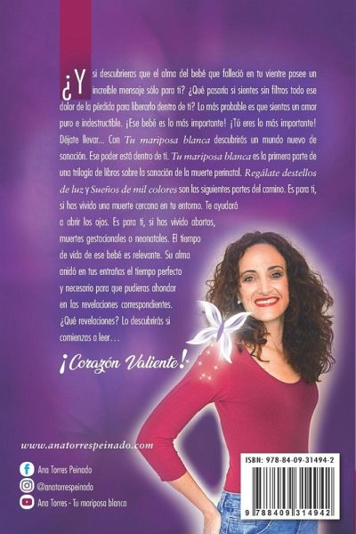 TU MARIPOSA BLANCA: Sana la pérdida de tu bebé Vol.1 ¿Eres una mamá en duelo? ¿Te sientes perdida? ¿Sola e incomprendida? ¿Quieres encontrar respuestas? ¿Buscas consuelo? ¿Deseas sentirte en paz? Este es tu espacio. EL LIBRO QUE DEBES LEER SI DESEAS SANAR EL DUELO GESTACIONAL, PERINATAL, NEONATAL, Y/O ABORTOS (VOL.1) Importa lo que sentiste y sientes por tu bebé. Importas tú. Importáis los dos. Tu experiencia es importante. Tu bebé es importante. Tú eres importante. Ambos sois importantes. Ambos sois amor incondicional. No estás sola. Tu mariposa blanca te acompañará. "Si deseas de corazón sanar tu duelo, Tu mariposa blanca te abraza, te consuela, y honra tus lágrimas" * ¿Qué BENEFICIOS obtendré con Tu mariposa blanca? + El propósito del libro es sanar tu vivencia y hallar respuestas por ti misma. + Te sentirás acompañada, guiada y sostenida. + Conectarás con tu esencia más pura. + Liberarás emociones del trauma a tu propio ritmo. + Conectarás con el alma de tu bebé. + Te adentrarás en el Universo de tu propia experiencia. +Transmutarás el dolor para convertirlo en amor y agradecimiento. + Vivirás un viaje de autodescubrimiento y sanación. + Reforzarás tu intuición. + Te irás sintiendo más en paz. + Conectarás con la parte más espiritual de la muerte, sabiendo que no es el final. ¿Qué más ME PUEDE APORTAR Tu mariposa blanca? -Tu mariposa blanca es un libro emocional que te llevará de la mano para sanar tu duelo. Despacito. Sin prisa. Con calma. Y lo más importante, acompañada. Tu mariposa blanca te puede sostener en esos momentos de dolor e incomprensión. En esos ratitos de silencio. En esos rincones de soledad. Te abraza con cariño y te da besos con mimo. Tu mariposa blanca porta un grandioso amor. A través de su lectura te adentrarás en el Universo de tu propia vivencia. Así podrás conectar con tu bebé. Y sanar. Tu mariposa blanca tiene un poder transmutador innegable. A través de su lectura podrás adentrarte en tus propias emociones para poder liberarlas. Tu mariposa blanca es tu aliado y amigo que será tu sostén en momentos de delirio. Tu mariposa blanca será tu canal para sanar y poder conectarte con tu bebé de una manera maravillosa y especial. Si estás leyendo estas líneas te abrazo fuerte. Muy fuerte. Puedes hacerlo. Puedes sanar. Y con ello, vivir en paz. TU MARIPOSA BLANCA... EL LIBRO DE CABECERA QUE TODA MAMÁ EN DUELO DEBERÍA LEER Llévate a casa un gran apoyo. Una ayuda amorosa. Un abrazo respetuoso. Tu mariposa blanca. Un libro que conectará con tu vivencia de una manera mágica y especial. ¡Te abrazo fuerte! Es momento de honrar tu vivencia. Es momento de quererte. Es momento de honrarle y honrarte. Hazlo por ti. Hazlo por él. TU MARIPOSA BLANCA... TE AYUDA DE CORAZÓN. ¡NO TE LA PUEDES PERDER!