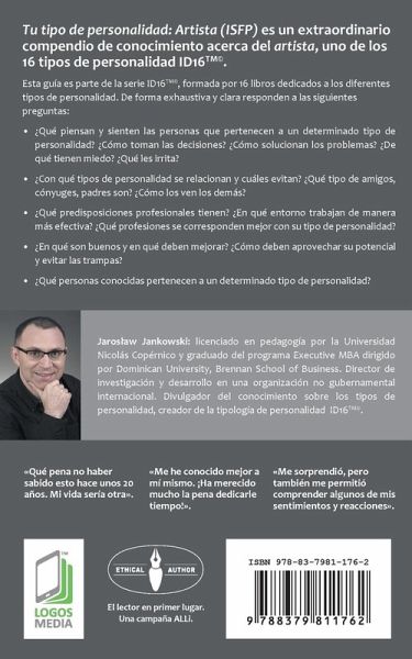 «Tu tipo de personalidad: Artista (ISFP)» es un extraordinario compendio de conocimiento acerca del artista, uno de los 16 tipos de personalidad ID16. Esta guía es parte de la serie ID16, formada por 16 libros dedicados a los diferentes tipos de personalidad. De forma exhaustiva y clara responden a las siguientes preguntas: ¿Qué piensan y sienten las personas que pertenecen a un determinado tipo de personalidad? ¿Cómo toman las decisiones? ¿Cómo solucionan los problemas? ¿De qué tienen miedo? ¿Qué les irrita? ¿Con qué tipos de personalidad se relacionan y cuáles evitan? ¿Qué tipo de amigos, cónyuges, padres son? ¿Cómo los ven los demás? ¿Qué predisposiciones profesionales tienen? ¿En qué entorno trabajan de manera más efectiva? ¿Qué profesiones se corresponden mejor con su tipo de personalidad? ¿En qué son buenos y en qué deben mejorar? ¿Cómo deben aprovechar su potencial y evitar las trampas? ¿Qué personas conocidas pertenecen a un determinado tipo de personalidad? ¿Qué sociedad muestra más rasgos característicos de un determinado tipo? En este libro también encontrarás la información más importante sobre la tipología ID16. Comentarios: «Qué pena no haber sabido esto hace unos 20 años. Mi vida sería otra». «Me he conocido mejor a mí mismo. ¡Ha merecido mucho la pena dedicarle tiempo!». «Me sorprendió, pero también me permitió comprender algunos de mis sentimientos y reacciones». Sobre la tipología de personalidad ID16: Las tipologías de personalidad relacionadas con la teoría de Carl Jung, a las que pertenece ID16, son una herramienta generalmente empleada en la práctica pedagógica, el coaching, la gestión de recursos humanos y en la orientación profesional y matrimonial. También constituyen la base de muchos programas de apoyo al desarrollo personal y al perfeccionamiento de las relaciones interpersonales. Los test de personalidad de Jung se han convertido en una herramienta estándar empleada por la mayoría de las empresas globales en el proceso de selección y en el desarrollo profesional de los empleados.
