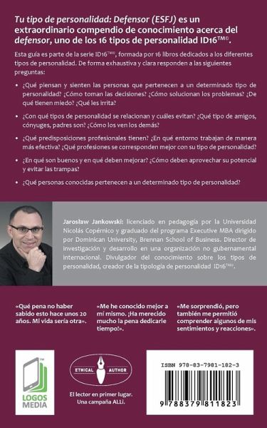 «Tu tipo de personalidad: Defensor (ESFJ)» es un extraordinario compendio de conocimiento acerca del defensor, uno de los 16 tipos de personalidad ID16. Esta guía es parte de la serie ID16, formada por 16 libros dedicados a los diferentes tipos de personalidad. De forma exhaustiva y clara responden a las siguientes preguntas: ¿Qué piensan y sienten las personas que pertenecen a un determinado tipo de personalidad? ¿Cómo toman las decisiones? ¿Cómo solucionan los problemas? ¿De qué tienen miedo? ¿Qué les irrita? ¿Con qué tipos de personalidad se relacionan y cuáles evitan? ¿Qué tipo de amigos, cónyuges, padres son? ¿Cómo los ven los demás? ¿Qué predisposiciones profesionales tienen? ¿En qué entorno trabajan de manera más efectiva? ¿Qué profesiones se corresponden mejor con su tipo de personalidad? ¿En qué son buenos y en qué deben mejorar? ¿Cómo deben aprovechar su potencial y evitar las trampas? ¿Qué personas conocidas pertenecen a un determinado tipo de personalidad? ¿Qué sociedad muestra más rasgos característicos de un determinado tipo? En este libro también encontrarás la información más importante sobre la tipología ID16. Comentarios: «Qué pena no haber sabido esto hace unos 20 años. Mi vida sería otra». «Me he conocido mejor a mí mismo. ¡Ha merecido mucho la pena dedicarle tiempo!». «Me sorprendió, pero también me permitió comprender algunos de mis sentimientos y reacciones». Sobre la tipología de personalidad ID16: Las tipologías de personalidad relacionadas con la teoría de Carl Jung, a las que pertenece ID16, son una herramienta generalmente empleada en la práctica pedagógica, el coaching, la gestión de recursos humanos y en la orientación profesional y matrimonial. También constituyen la base de muchos programas de apoyo al desarrollo personal y al perfeccionamiento de las relaciones interpersonales. Los test de personalidad de Jung se han convertido en una herramienta estándar empleada por la mayoría de las empresas globales en el proceso de selección y en el desarrollo profesional de los empleados.