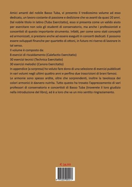 Questo volume offre una collezione di oltre 100 pagine di esercizi originali per Basso Tuba, con accompagnamento pianistico, pensati per musicisti di ogni livello. Armonie innovative, melodie coinvolgenti e una sezione dedicata al riscaldamento, alla tecnica e all'espressività musicale renderanno il tuo studio un'esperienza stimolante e gratificante.