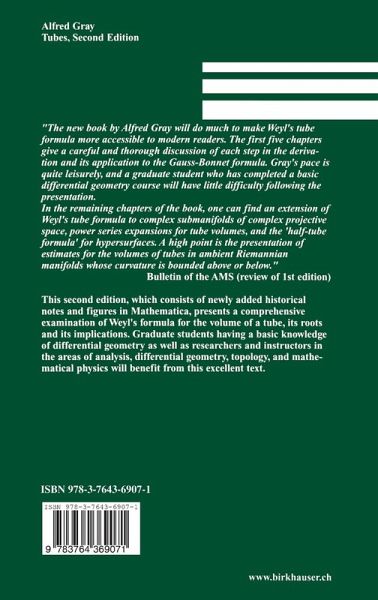 "The new book by Alfred Gray will do much to make Weyl's tube formula more accessible to modern readers. The first five chapters give a careful and thorough discussion of each step in the derivation and its application to the Gauss-Bonnet formula. Gray's pace is quite leisurely, and a gradualte student who has completed a basic differential geometry course will have little difficulty following the presentation. In the remaining chapters of the book, one can find an extension of Weyl's tube formula to complex submanifolds of complex projective space, power series expansions for tube volumes, and the 'half-tube formula' for hypersurfaces. A high point is the presentation of estimates for the volumes of tubes in ambient Riemannian manifolds whose curvature is bounded above or below." - BULLETIN OF THE AMS (Review of the First Edition)