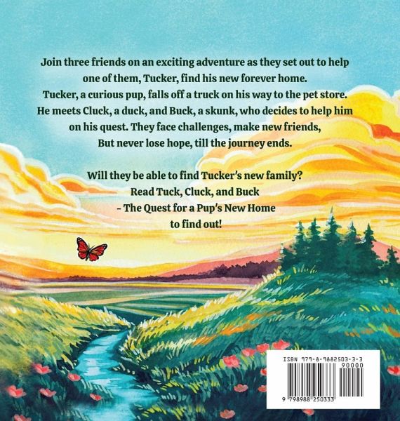 Join three friends on an exciting adventure as they set out to help one of them, Tucker, find his new forever home. Tucker, a fluffy and curious pup, falls off a truck on his way to the pet store and meets Cluck, a duck, and Buck, a skunk, who decides to help him on his quest. They face challenges and make new friends through the journey, but they never lose hope. Will they be able to find Tucker's new family? Read Tuck, Cluck, and Buck - The Quest for a Pup's New Home to find out! Key Features A great resource for early childhood learning and beginner readers Fun rhyming story, great for speech therapy Building friendships and helping others Humor that will have both children and adults giggling throughout Beautifully illustrated in a classic style Meet the real Tucker page