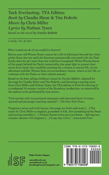 What would you do if you could live forever? Eleven-year-old Winnie Foster yearns for a life of adventure beyond her white picket fence, but not until she becomes unexpectedly entwined with the Tuck family does she get more than she could have imagined. When Winnie learns of the magic behind the Tuck's immortality, she must fight to protect their secret from those who would do anything for a chance at eternal life. As her adventure unfolds, Winnie faces an extraordinary choice: return to her life, or continue with the Tucks on their infinite journey. Based on the best-selling children's classic by Natalie Babbitt, adapted for the stage by Claudia Shear and Tim Federle, and featuring a soaring score from Chris Miller and Nathan Tysen, the TYA edition of Tuck Everlasting is a condensed 70-minute version of the Broadway production, re-conceived by the authors to be performed by nine actors.