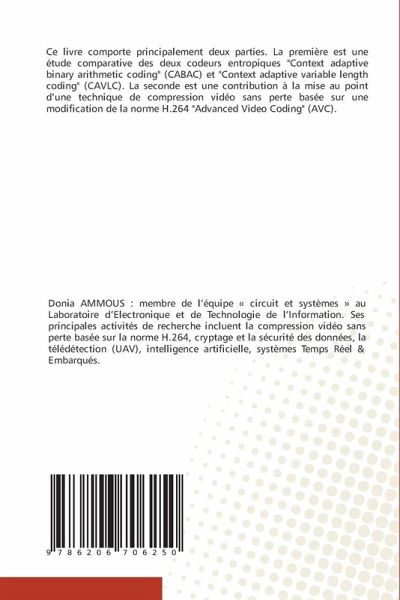 Ce livre comporte principalement deux parties. La première est une étude comparative des deux codeurs entropiques "Context adaptive binary arithmetic coding" (CABAC) et "Context adaptive variable length coding" (CAVLC). La seconde est une contribution à la mise au point d'une technique de compression vidéo sans perte basée sur une modification de la norme H.264 "Advanced Video Coding" (AVC).