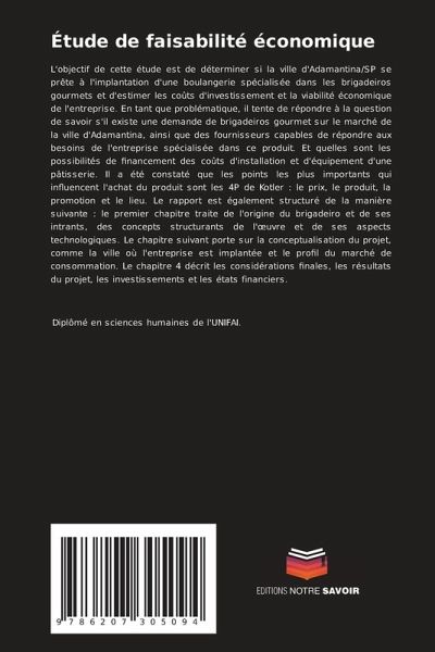 L'objectif de cette étude est de déterminer si la ville d'Adamantina/SP se prête à l'implantation d'une boulangerie spécialisée dans les brigadeiros gourmets et d'estimer les coûts d'investissement et la viabilité économique de l'entreprise. En tant que problématique, il tente de répondre à la question de savoir s'il existe une demande de brigadeiros gourmet sur le marché de la ville d'Adamantina, ainsi que des fournisseurs capables de répondre aux besoins de l'entreprise spécialisée dans ce produit. Et quelles sont les possibilités de financement des coûts d'installation et d'équipement d'une pâtisserie. Il a été constaté que les points les plus importants qui influencent l'achat du produit sont les 4P de Kotler : le prix, le produit, la promotion et le lieu. Le rapport est également structuré de la manière suivante : le premier chapitre traite de l'origine du brigadeiro et de ses intrants, des concepts structurants de l'oeuvre et de ses aspects technologiques. Le chapitre suivant porte sur la conceptualisation du projet, comme la ville où l'entreprise est implantée et le profil du marché de consommation. Le chapitre 4 décrit les considérations finales, les résultats du projet, les investissements et les états financiers.