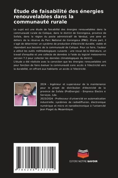 Le sujet est une étude de faisabilité des énergies renouvelables dans la communauté rurale de Catique, dans le district de Gorongosa, province de Sofala, dans la région du poste administratif de Vanduzi, une zone en dehors de la réserve du Parc National de Gorongosa (PNG). D'une part, il s'agit de déterminer un système de production d'électricité durable, viable et répondant aux besoins de la communauté de Catique. Pour ce faire, l'auteur a utilisé les outils méthodologiques suivants : une revue de la littérature, un travail d'enquête et une collecte de données à l'aide du logiciel meteonorms version 7.2 pour collecter les données climatologiques du district.L'étude a été réalisée avec la conviction que les énergies renouvelables ont pour fonction de faire évoluer la communauté sans accès à l'électricité vers la durabilité, en offrant aux habitants un accès à l'électricité.