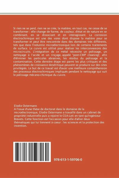 Si rien ne se perd, rien ne se crée, la matière, en tout cas, ne cesse de se transformer : elle change de forme, de couleur, d'état et de nature en se combinant, en se dissociant et en interagissant. La corrosion électrochimique est une des voies dont dispose la matière pour se transformer et peut être rencontrée dans des domaines très différents, tels que dans l'industrie microélectronique lors de certains traitements de surface. Le cuivre est utilisé pour réaliser les interconnexions des microcircuits. L'intégration de ce métal nécessite un polissage, un nettoyage à l'acide et un rinçage, appelé "post-CMP cleaning", afin d'éliminer les particules abrasives, les résidus du polissage et la contamination. Cette dernière étape est parmi les plus critiques et des phénomènes de croissance dendritique peuvent se produire sur des sites privilégiés. Le but de ce travail est d'avoir une meilleure compréhension des processus électrochimiques impliqués pendant le nettoyage qui suit le polissage mécano-chimique du cuivre.