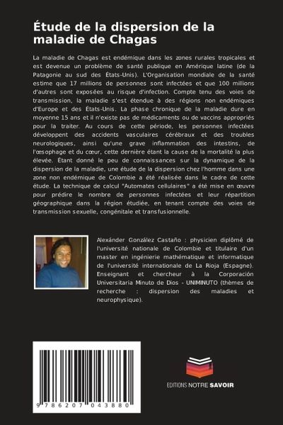 La maladie de Chagas est endémique dans les zones rurales tropicales et est devenue un problème de santé publique en Amérique latine (de la Patagonie au sud des États-Unis). L'Organisation mondiale de la santé estime que 17 millions de personnes sont infectées et que 100 millions d'autres sont exposées au risque d'infection. Compte tenu des voies de transmission, la maladie s'est étendue à des régions non endémiques d'Europe et des États-Unis. La phase chronique de la maladie dure en moyenne 15 ans et il n'existe pas de médicaments ou de vaccins appropriés pour la traiter. Au cours de cette période, les personnes infectées développent des accidents vasculaires cérébraux et des troubles neurologiques, ainsi qu'une grave inflammation des intestins, de l'oesophage et du coeur, cette dernière étant la cause de la mortalité la plus élevée. Étant donné le peu de connaissances sur la dynamique de la dispersion de la maladie, une étude de la dispersion chez l'homme dans une zone non endémique de Colombie a été réalisée dans le cadre de cette étude. La technique de calcul "Automates cellulaires" a été mise en oeuvre pour prédire le nombre de personnes infectées et leur répartition géographique dans la région étudiée, en tenant compte des voies de transmission sexuelle, congénitale et transfusionnelle.