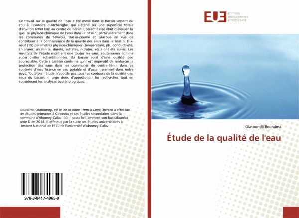 Ce travail sur la qualité de l'eau a été mené dans le bassin versant du zou à l'exutoire d'Atchérigbé, qui s'étend sur une superficie totale d'environ 6980 km² au centre du Bénin. L'objectif visé était d'évaluer la qualité physico-chimique de l'eau dans le bassin, particulièrement dans les communes de Savalou, Dassa-Zoumè et Glazoué en vue de contribuer à la connaissance de la qualité des eaux dans le bassin. Dix-neuf (19) paramètres physico-chimiques (température, pH, conductivité, chlorures, alcalinité, dureté, sulfates, nitrates, etc.) ont été suivis. Les résultats de l'étude montrent que toutes les eaux, souterraines comme superficielles échantillonnées du bassin sont d'une qualité peu appréciable. Cette situation confirme qu'il est impératif de renforcer la protection des eaux dans les communes du centre-Bénin dans ce contexte d'insuffisance en eau potable et d'assainissement dans notre pays. Toutefois l'étude n'aborde pas tous les contours de la qualité des eaux du bassin, il urge donc d'approfondir les recherches tout en considérant les analyses bactériologiques.