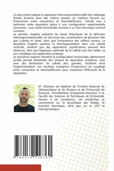 Ce document explore la séparation thermogravitationnelle des mélanges fluides binaires dans des milieux poreux, en mettant l'accent sur l'interaction entre convection et thermodiffusion. L'étude vise à optimiser cette séparation grâce à une configuration expérimentale innovante : une cavité horizontale soumise à un flux thermique vertical constant.Le premier chapitre présente les bases théoriques de la diffusion thermogravitationnelle, en discutant des contributions de pionniers tels que Ludwig et Soret, ainsi que l'importance des milieux poreux. Le deuxième chapitre examine la thermogravitation dans une cellule verticale, révélant que des séparations significatives peuvent être obtenues, bien que l'épaisseur optimale de la cellule soit très faible, ce qui complique son application pratique.Le troisième chapitre introduit la configuration horizontale, démontrant qu'elle permet d'atteindre des niveaux de séparation similaires, mais avec des dimensions de cellule plus grandes, facilitant ainsi l'expérimentation. Les résultats soulignent l'importance du couplage entre convection et thermodiffusion pour maximiser l'efficacité de la séparation.