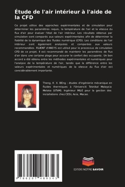 Ce projet utilise des approches expérimentales et de simulation pour déterminer les paramètres requis, la température de l'air et la vitesse du flux d'air pour évaluer l'état de l'air intérieur. Les résultats obtenus par simulation sont comparés aux valeurs expérimentales afin de déterminer la fiabilité de la dynamique des fluides numérique (CFD). Les conditions de l'air intérieur sont également analysées et comparées aux valeurs recommandées. FLUENT d'ANSYS est utilisé pour le processus de simulation CFD de ce projet. Il est recommandé de maintenir les paramètres de flux d'air dans une certaine plage pour assurer le confort des occupants. Un bon accord a été obtenu entre les méthodes expérimentales et numériques pour l'analyse de la température de l'air, tandis que la différence entre les valeurs expérimentales et numériques de la vitesse du flux d'air est considérablement importante.