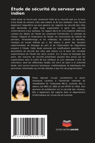 Cette étude ne fournit pas seulement l'état de la sécurité web sur la base d'une étude de certains sites web indiens et de leur évolution, mais fournit également l'algorithme qui peut générer les rapports de sécurité des sites web demandés et aider toute organisation à gérer leur sécurité conformément à leur politique. Ce rapport décrit en cinq chapitres différents contient les détails de l'étude qui comprend l'introduction, le contexte de l'étude, l'objectif et l'importance de l'étude, les instruments de collecte de données, l'échantillonnage et les méthodes de collecte de données, l'analyse du travail d'étude qui a été obtenu à partir des données expérimentales de balayage du port et de l'observation de l'algorithme proposé à l'étude. Cette étude présente les modifications apportées aux paramètres de sécurité des sites web indiens sur la base des résultats expérimentaux de l'étude des ports ouverts. Sur la base du balayage des ports, des mesures de sécurité préventives peuvent être prises par les organisations dans le cadre de leur politique. Je suis redevable à tous les chercheurs dont les différentes études ont servi de base à la présente étude, ainsi qu'aux mesures techniques, mathématiques et statistiques des personnes renommées qui ont été utilisées à des fins de programmation.