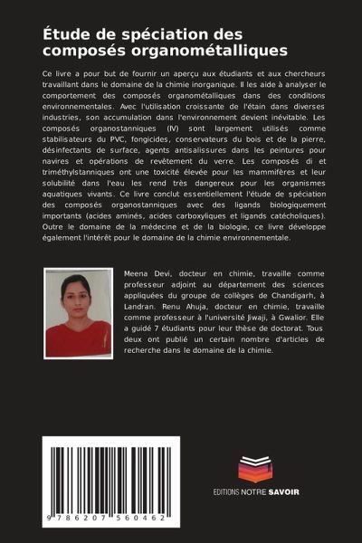 Ce livre a pour but de fournir un aperçu aux étudiants et aux chercheurs travaillant dans le domaine de la chimie inorganique. Il les aide à analyser le comportement des composés organométalliques dans des conditions environnementales. Avec l'utilisation croissante de l'étain dans diverses industries, son accumulation dans l'environnement devient inévitable. Les composés organostanniques (IV) sont largement utilisés comme stabilisateurs du PVC, fongicides, conservateurs du bois et de la pierre, désinfectants de surface, agents antisalissures dans les peintures pour navires et opérations de revêtement du verre. Les composés di et triméthylstanniques ont une toxicité élevée pour les mammifères et leur solubilité dans l'eau les rend très dangereux pour les organismes aquatiques vivants. Ce livre conclut essentiellement l'étude de spéciation des composés organostanniques avec des ligands biologiquement importants (acides aminés, acides carboxyliques et ligands catécholiques). Outre le domaine de la médecine et de la biologie, ce livre développe également l'intérêt pour le domaine de la chimie environnementale.