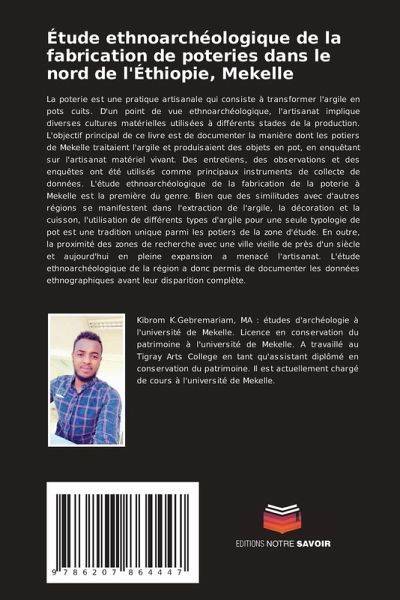 La poterie est une pratique artisanale qui consiste à transformer l'argile en pots cuits. D'un point de vue ethnoarchéologique, l'artisanat implique diverses cultures matérielles utilisées à différents stades de la production. L'objectif principal de ce livre est de documenter la manière dont les potiers de Mekelle traitaient l'argile et produisaient des objets en pot, en enquêtant sur l'artisanat matériel vivant. Des entretiens, des observations et des enquêtes ont été utilisés comme principaux instruments de collecte de données. L'étude ethnoarchéologique de la fabrication de la poterie à Mekelle est la première du genre. Bien que des similitudes avec d'autres régions se manifestent dans l'extraction de l'argile, la décoration et la cuisson, l'utilisation de différents types d'argile pour une seule typologie de pot est une tradition unique parmi les potiers de la zone d'étude. En outre, la proximité des zones de recherche avec une ville vieille de près d'un siècle et aujourd'hui en pleine expansion a menacé l'artisanat. L'étude ethnoarchéologique de la région a donc permis de documenter les données ethnographiques avant leur disparition complète.