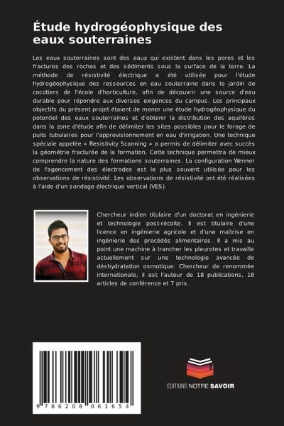 Les eaux souterraines sont des eaux qui existent dans les pores et les fractures des roches et des sédiments sous la surface de la terre. La méthode de résistivité électrique a été utilisée pour l'étude hydrogéophysique des ressources en eau souterraine dans le jardin de cocotiers de l'école d'horticulture, afin de découvrir une source d'eau durable pour répondre aux diverses exigences du campus. Les principaux objectifs du présent projet étaient de mener une étude hydrogéophysique du potentiel des eaux souterraines et d'obtenir la distribution des aquifères dans la zone d'étude afin de délimiter les sites possibles pour le forage de puits tubulaires pour l'approvisionnement en eau d'irrigation. Une technique spéciale appelée « Resistivity Scanning » a permis de délimiter avec succès la géométrie fracturée de la formation. Cette technique permettra de mieux comprendre la nature des formations souterraines. La configuration Wenner de l'agencement des électrodes est le plus souvent utilisée pour les observations de résistivité. Les observations de résistivité ont été réalisées à l'aide d'un sondage électrique vertical (VES).