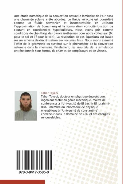 Une étude numérique de la convection naturelle laminaire de l air dans une cheminée solaire a été abordée. Le fluide véhiculé est considéré comme un fluide newtonien et incompressible, en utilisant l approximation de Boussinesq et la formulation vorticité-fonction de courant en coordonnées hyperboliques. Nous avons pris comme conditions de chauffage des parois isothermes pour notre collecteur (Tc pour le sol et Tf pour le toit). La résolution de ces équations est basée sur un schéma de discrétisation aux volumes finis. Nous avons examiné l effet de la géométrie du système sur le phénomène de la convection naturelle dans la cheminée. Finalement, les résultats de la simulation ont été donnés sous forme, de champs de température et de vitesse.