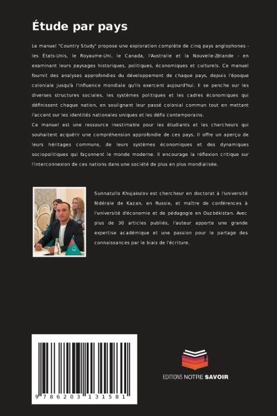 Le manuel "Country Study" propose une exploration complète de cinq pays anglophones - les États-Unis, le Royaume-Uni, le Canada, l'Australie et la Nouvelle-Zélande - en examinant leurs paysages historiques, politiques, économiques et culturels. Ce manuel fournit des analyses approfondies du développement de chaque pays, depuis l'époque coloniale jusqu'à l'influence mondiale qu'ils exercent aujourd'hui. Il se penche sur les diverses structures sociales, les systèmes politiques et les cadres économiques qui définissent chaque nation, en soulignant leur passé colonial commun tout en mettant l'accent sur les identités nationales uniques et les défis contemporains.Ce manuel est une ressource inestimable pour les étudiants et les chercheurs qui souhaitent acquérir une compréhension approfondie de ces pays. Il offre un aperçu de leurs héritages communs, de leurs systèmes économiques et des dynamiques sociopolitiques qui façonnent le monde moderne. Il encourage la réflexion critique sur l'interconnexion de ces nations dans une société de plus en plus mondialisée.
