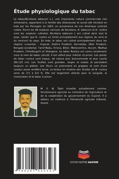 Le tabac(Nicotiana tabacum L.), une importante culture commerciale non alimentaire, appartient à la famille des Solanaceae et aurait été introduit en Inde par les Portugais en 1603, en provenance de son Amérique centrale natale. Parmi les 66 espèces connues de Nicotiana, N. tabacum et N. rustica sont les espèces cultivées. Nicotiana tabacum L est cultivé dans tout le pays, tandis que N. rustica se limite principalement aux régions du nord et du nord-est du pays. En Inde, le tabac est cultivé principalement dans les régions suivantes : Gujarat, Andhra Pradesh, Karnataka, Uttar Pradesh, Bengale occidental, Tamil Nadu, Orissa, Bihar, Maharashtra, Assam, Madhya Pradesh, Chhattisgarh et Telangana. Le tabac Rustica est connu localement sous le nom de tabac calcutti. Il est utilisé pour mâcher et priser. Les plants de tabac rustica sont trapus, de nature plus buissonnante et plus courts (90-120 cm). Les feuilles sont grandes, larges et ovales et possèdent toujours un pétiole. Les fleurs se présentent en grappes et sont d'une couleur jaune verdâtre terne. La teneur en nicotine des feuilles de N. rustica varie de 3,5 à 8,0 %. Elle est largement utilisée pour le narguilé, la mastication et le tabac à priser.