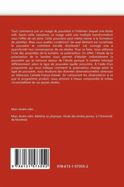 Tout commence par un nuage de poussière à l''intérieur duquel une étoile naît. Après cette naissance, ce nuage subit une multiple transformation sous l''effet de cet astre. Cette poussière peut même mener à la formation de planètes. Mais sous quelles conditions? De quel élément est constituée la poussière et comment est-elle distribuée? Cet ouvrage vise à approfondir nos connaissances de ces étoiles. Pour ce faire, nous utilisons l''une des propriétés de la lumière; sa polarisation. En effet, l''étude de la polarisation de la lumière nous permet d''étudier indirectement la poussière qui se retrouve autour de l''étoile puisque la lumière interagit différemment selon le type de poussière quelle rencontre. À l''aide d''un programme qui nous indique comment la polarisation change selon le type de poussière, nous étudions des données observationnelles obtenues au télescope Canada-France-Hawaii. En comparant les observations à ce que le programme produit, nous arrivons à mieux comprendre le milieu circumstellaire de ces jeunes étoiles.