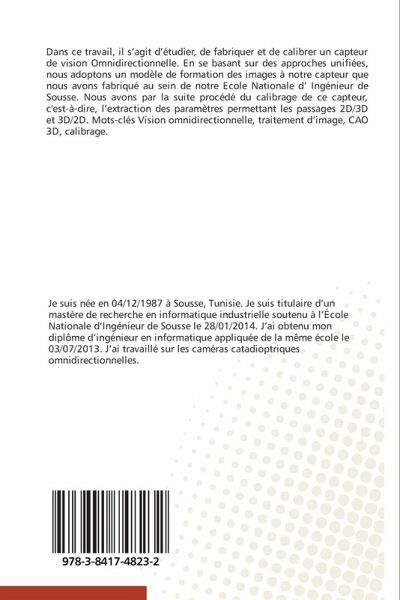 Dans ce travail, il s'agit d'étudier, de fabriquer et de calibrer un capteur de vision Omnidirectionnelle. En se basant sur des approches unifiées, nous adoptons un modèle de formation des images à notre capteur que nous avons fabriqué au sein de notre Ecole Nationale d' Ingénieur de Sousse. Nous avons par la suite procédé du calibrage de ce capteur, c'est-à-dire, l'extraction des paramètres permettant les passages 2D/3D et 3D/2D. Mots-clés Vision omnidirectionnelle, traitement d'image, CAO 3D, calibrage.