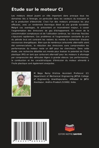 Les moteurs diesel jouent un rôle important dans presque tous les domaines liés à l'énergie, en particulier dans les secteurs du transport et de la production d'électricité. C'est l'un des moteurs principaux les plus efficaces, avec un rendement thermique élevé et une grande durabilité. Malgré ces avantages, ils présentent un inconvénient majeur, à savoir l'augmentation des émissions de gaz d'échappement. En raison de la consommation somptueuse et de l'utilisation continue, les réserves fossiles s'épuisent rapidement. Ces problèmes et l'augmentation constante du prix du pétrole brut ont contraint les nations du monde à rechercher d'autres ressources énergétiques. Bien que de nombreux carburants alternatifs aient été commercialisés, la réduction des émissions sans compromettre les performances du moteur reste un défi pour les chercheurs. Dans cette étude, une recherche détaillée est menée pour évaluer le potentiel de l'huile plastique (PO) en tant que carburant alternatif pour les moteurs à allumage par compression des véhicules légers à grande vitesse. Les performances, la combustion et les caractéristiques d'émission du moteur alimenté à l'huile plastique sont également analysées.