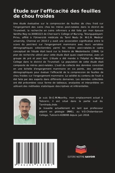 Une étude évaluative sur la compression de feuilles de chou froid sur l'engorgement des seins chez les mères post-natales dans le district de Tirunelveli, la recherche en soins infirmiers a été faite par mon épouse Vanitha Reg no;30083223 de Cherraan's College of Nursing, Telungupalayam Pirivu, affilié à l'Université médicale du Tamil Nadu Dr. M.G.R. Medical university, Chennai en 2010.il y avait une association significative entre le score du post-test sur l'engorgement mammaire avec leurs variables démographiques sélectionnées parmi les mères post-natales.le cadre conceptuel de l'étude était basé sur la théorie de Wiedenbacks (1964). Le plan de recherche utilisé pour cette étude était quasi expérimental, avec un groupe de pré et post test. L'étude a été menée à l'hôpital du Medical College dans le district de Tirunelveli. La population de cette étude était composée de mères post-natales. L'outil de collecte des données consistait en une échelle d'engorgement mammaire en six points, des variables démographiques pour évaluer l'efficacité de la compression de feuilles de chou froides sur l'engorgement mammaire. La validité du contenu de l'outil a été faite par des experts dans différents domaines. Les données collectées ont été présentées sous forme de tableaux, analysées et interprétées en utilisant des méthodes statistiques descriptives et inférentielles.