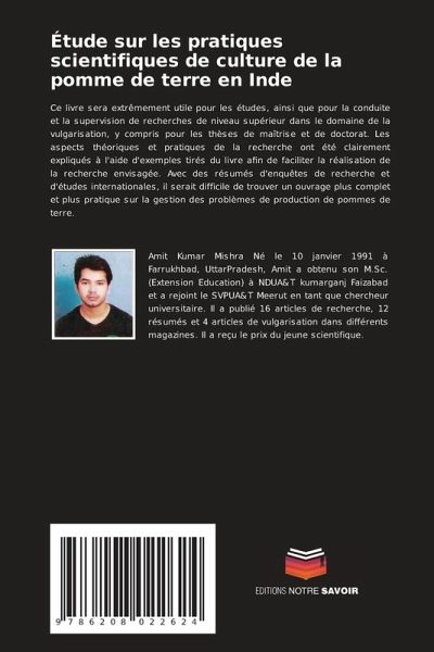 Ce livre sera extrêmement utile pour les études, ainsi que pour la conduite et la supervision de recherches de niveau supérieur dans le domaine de la vulgarisation, y compris pour les thèses de maîtrise et de doctorat. Les aspects théoriques et pratiques de la recherche ont été clairement expliqués à l'aide d'exemples tirés du livre afin de faciliter la réalisation de la recherche envisagée. Avec des résumés d'enquêtes de recherche et d'études internationales, il serait difficile de trouver un ouvrage plus complet et plus pratique sur la gestion des problèmes de production de pommes de terre.