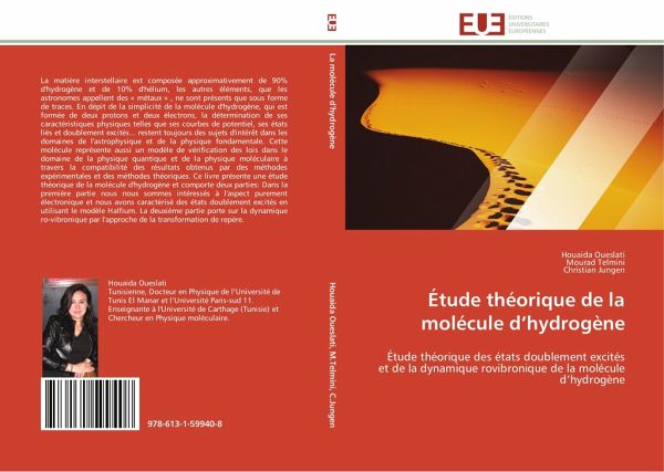 La matière interstellaire est composée approximativement de 90% d'hydrogène et de 10% d'hélium, les autres éléments, que les astronomes appellent des « métaux » , ne sont présents que sous forme de traces. En dépit de la simplicité de la molécule d'hydrogène, qui est formée de deux protons et deux électrons, la détermination de ses caractéristiques physiques telles que ses courbes de potentiel, ses états liés et doublement excités... restent toujours des sujets d'intérêt dans les domaines de l'astrophysique et de la physique fondamentale. Cette molécule représente aussi un modèle de vérification des lois dans le domaine de la physique quantique et de la physique moléculaire à travers la compatibilité des résultats obtenus par des méthodes expérimentales et des méthodes théoriques. Ce livre présente une étude théorique de la molécule d'hydrogène et comporte deux parties: Dans la première partie nous nous sommes intéressés à l'aspect purement électronique et nous avons caractérisé des états doublement excités en utilisant le modèle Halfium. La deuxième partie porte sur la dynamique ro-vibronique par l'approche de la transformation de repère.