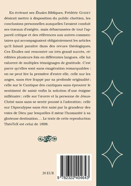 En écrivant ses Études Bibliques, Frédéric Godet désirait mettre à disposition du public chrétien, les conclusions personnelles auxquelles l'avaient conduit ses travaux d'exégète, mais débarrassées de tout l'appareil critique et des références aux autres commentaires qui accompagnaient obligatoirement les articles qu'il faisait paraître dans des revues théologiques. Ces Études ont rencontré un très grand succès, rééditées plusieurs fois en différentes langues, elle lui valurent de multiples témoignages de gratitude. C'est parce qu'elles sont sans exagération remarquables : on ne peut lire la première d'entre elle, celle sur les anges, sans être frappé par sa profonde originalité ; celle sur le Cantique des cantiques sans éprouver le sentiment de saisir enfin la solution d'une énigme millénaire ; celle sur l'oeuvre et la personne de Jésus-Christ sans sans se sentir poussé à l'adoration ; celle sur l'Apocalypse sans être saisi par la grandeur des voies de Dieu par lesquelles il mène l'humanité à sa glorieuse destination... Cette reproduction ThéoTeX regroupe les deux volumes originaux (Ancien et Nouveau Testament) ; le texte est celui de 1898.