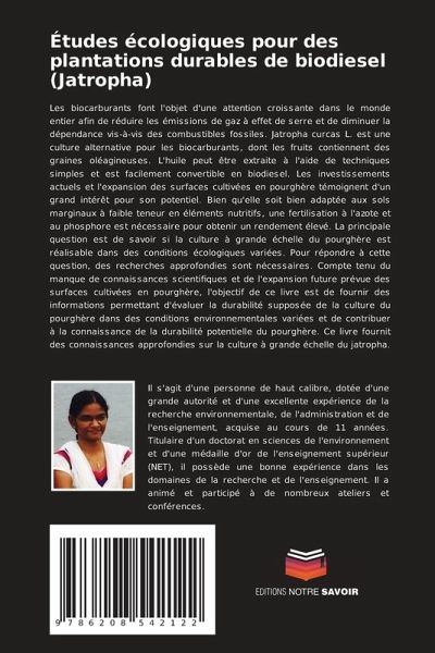 Les biocarburants font l'objet d'une attention croissante dans le monde entier afin de réduire les émissions de gaz à effet de serre et de diminuer la dépendance vis-à-vis des combustibles fossiles. Jatropha curcas L. est une culture alternative pour les biocarburants, dont les fruits contiennent des graines oléagineuses. L'huile peut être extraite à l'aide de techniques simples et est facilement convertible en biodiesel. Les investissements actuels et l'expansion des surfaces cultivées en pourghère témoignent d'un grand intérêt pour son potentiel. Bien qu'elle soit bien adaptée aux sols marginaux à faible teneur en éléments nutritifs, une fertilisation à l'azote et au phosphore est nécessaire pour obtenir un rendement élevé. La principale question est de savoir si la culture à grande échelle du pourghère est réalisable dans des conditions écologiques variées. Pour répondre à cette question, des recherches approfondies sont nécessaires. Compte tenu du manque de connaissances scientifiques et de l'expansion future prévue des surfaces cultivées en pourghère, l'objectif de ce livre est de fournir des informations permettant d'évaluer la durabilité supposée de la culture du pourghère dans des conditions environnementales variées et de contribuer à la connaissance de la durabilité potentielle du pourghère. Ce livre fournit des connaissances approfondies sur la culture à grande échelle du jatropha.