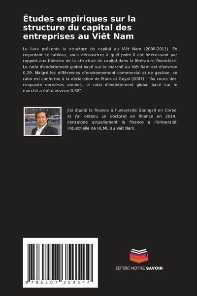 Le livre présente la structure du capital au Viêt Nam (2008-2011). En regardant ce tableau, vous découvrirez à quel point il est intéressant par rapport aux théories de la structure du capital dans la littérature financière. Le ratio d'endettement global basé sur le marché au Viêt Nam est d'environ 0,29. Malgré les différences d'environnement commercial et de gestion, ce ratio est conforme à la déclaration de Frank et Goyal (2007) : "Au cours des cinquante dernières années, le ratio d'endettement global basé sur le marché a été d'environ 0,32".