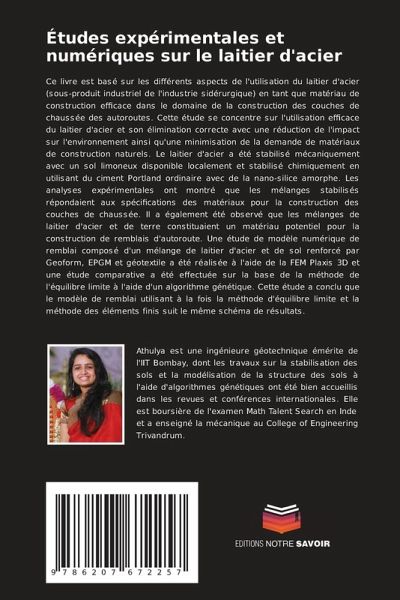 Ce livre est basé sur les différents aspects de l'utilisation du laitier d'acier (sous-produit industriel de l'industrie sidérurgique) en tant que matériau de construction efficace dans le domaine de la construction des couches de chaussée des autoroutes. Cette étude se concentre sur l'utilisation efficace du laitier d'acier et son élimination correcte avec une réduction de l'impact sur l'environnement ainsi qu'une minimisation de la demande de matériaux de construction naturels. Le laitier d'acier a été stabilisé mécaniquement avec un sol limoneux disponible localement et stabilisé chimiquement en utilisant du ciment Portland ordinaire avec de la nano-silice amorphe. Les analyses expérimentales ont montré que les mélanges stabilisés répondaient aux spécifications des matériaux pour la construction des couches de chaussée. Il a également été observé que les mélanges de laitier d'acier et de terre constituaient un matériau potentiel pour la construction de remblais d'autoroute. Une étude de modèle numérique de remblai composé d'un mélange de laitier d'acier et de sol renforcé par Geoform, EPGM et géotextile a été réalisée à l'aide de la FEM Plaxis 3D et une étude comparative a été effectuée sur la base de la méthode de l'équilibre limite à l'aide d'un algorithme génétique. Cette étude a conclu que le modèle de remblai utilisant à la fois la méthode d'équilibre limite et la méthode des éléments finis suit le même schéma de résultats.