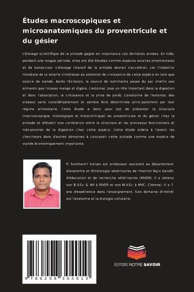 L'élevage scientifique de la pintade gagne en importance ces dernières années. En Inde, pendant une longue période, elles ont été élevées comme espèces aviaires ornementales et de basse-cour. L'élevage intensif de la pintade devrait s'accélérer, car l'industrie mondiale de la volaille s'intéresse au potentiel de croissance de cette espèce en tant que source de viande. Après l'éclosion, la source de nutriments passe du sac vitellin aux aliments que l'oiseau mange et digère. L'estomac joue un rôle important dans la digestion et donc l'absorption, la croissance et la prise de poids. L'anatomie de l'estomac des oiseaux varie considérablement et semble être déterminée principalement par leur régime alimentaire. Cette étude a donc pour but de présenter la structure (macroscopique, histologique et histochimique) du proventricule et du gésier chez la pintade et d'établir une corrélation entre la structure et les processus fonctionnels et mécanismes de la digestion chez cette espèce. Cette étude aidera à l'avenir les chercheurs dans d'autres domaines à concevoir cette pintade comme une espèce de viande économiquement importante.