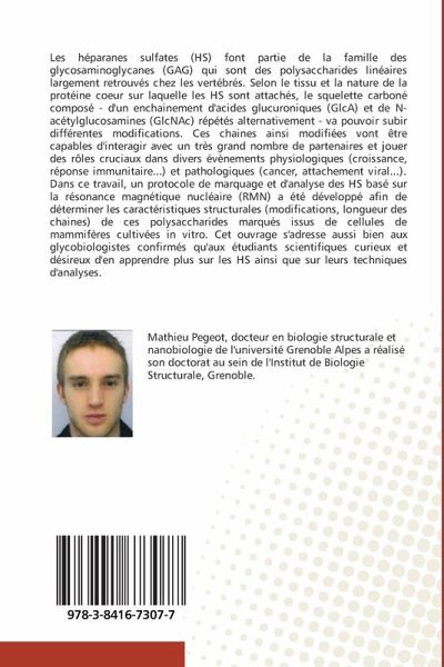 Les héparanes sulfates (HS) font partie de la famille des glycosaminoglycanes (GAG) qui sont des polysaccharides linéaires largement retrouvés chez les vertébrés. Selon le tissu et la nature de la protéine coeur sur laquelle les HS sont attachés, le squelette carboné composé - d'un enchainement d'acides glucuroniques (GlcA) et de N-acétylglucosamines (GlcNAc) répétés alternativement - va pouvoir subir différentes modifications. Ces chaines ainsi modifiées vont être capables d'interagir avec un très grand nombre de partenaires et jouer des rôles cruciaux dans divers évènements physiologiques (croissance, réponse immunitaire...) et pathologiques (cancer, attachement viral...). Dans ce travail, un protocole de marquage et d'analyse des HS basé sur la résonance magnétique nucléaire (RMN) a été développé afin de déterminer les caractéristiques structurales (modifications, longueur des chaines) de ces polysaccharides marqués issus de cellules de mammifères cultivées in vitro. Cet ouvrage s'adresse aussi bien aux glycobiologistes confirmés qu'aux étudiants scientifiques curieux et désireux d'en apprendre plus sur les HS ainsi que sur leurs techniques d'analyses.