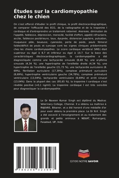 On s'est efforcé d'étudier le profil clinique, le profil électrocardiographique, de comparer l'efficacité des ECG, de la radiographie et de la troponine I cardiaque et d'entreprendre un traitement rationnel. Anorexie, diminution de l'appétit, faiblesse, dépression, morosité, facilité d'effort, appétit réfractaire, ascite, faiblesse postérieure, toux, dyspnée, distension jugulaire, pulsation, muqueuse pâle, boueuse, cyanosée, perte de poids, pouls fémoral faible/déficit de pouls et syncope sont les signes cliniques prédominants chez les chiens cardiomyopathes. Le score cardiaque vertébral (VHS) était supérieur ou égal à 8,7 et inférieur ou égal à 10,7. Sur la base des caractéristiques électrocardiographiques, la cardiomyopathie a été diagnostiquée comme une tachycardie sinusale (8,69 %), une arythmie sinusale (4,34 %), une hypertrophie de l'oreillette droite (4,34 %), une hypertrophie de l'oreillette gauche (21,73 %), une tachycardie auriculaire (8. 69%), fibrillation auriculaire (17,39%), complexe prématuré auriculaire (8,69%), hypertrophie ventriculaire gauche (34,78%), complexe prématuré ventriculaire (13,04%), tachycardie ventriculaire (8,69%) et arrêt sinusal (13,04%). Dans la plupart des cas (95,65 %), la troponine I cardiaque s'est révélée positive (>0,1 ng/ml). La troponine cardiaque I est très sensible pour diagnostiquer la cardiomyopathie.