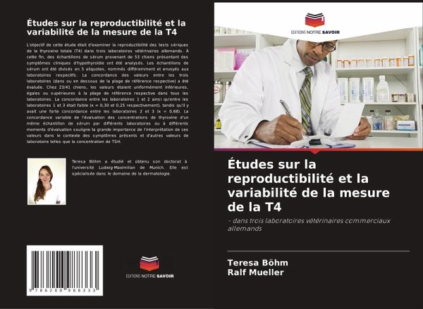 L'objectif de cette étude était d'examiner la reproductibilité des tests sériques de la thyroxine totale (T4) dans trois laboratoires vétérinaires allemands. À cette fin, des échantillons de sérum provenant de 53 chiens présentant des symptômes cliniques d'hypothyroïdie ont été analysés. Les échantillons de sérum ont été divisés en 5 aliquotes, nommés différemment et envoyés aux laboratoires respectifs. La concordance des valeurs entre les trois laboratoires (dans ou en dessous de la plage de référence respective) a été évaluée. Chez 23/41 chiens, les valeurs étaient uniformément inférieures, égales ou supérieures à la plage de référence respective dans tous les laboratoires. La concordance entre les laboratoires 1 et 2 ainsi qu'entre les laboratoires 1 et 3 était faible ( = 0,30 et 0,25 respectivement), tandis qu'il y avait une forte concordance entre les laboratoires 2 et 3 ( = 0,68). La concordance variable de l'évaluation des concentrations de thyroxine d'un même échantillon de sérum par différents laboratoires ou à différents moments d'évaluation souligne la grande importance de l'interprétation de ces valeurs dans le contexte des symptômes présents et d'autres valeurs de laboratoire telles que la concentration de TSH.