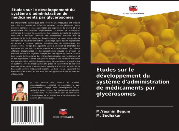 Les changements économiques dans l'industrie pharmaceutique ont entraîné une réduction notable de l'offre de nouvelles entités chimiques. Cette situation, combinée à une augmentation des expirations de brevets et à un renforcement des contrôles réglementaires, a conduit de nombreuses entreprises à repenser la conception de leurs produits existants. La tendance croissante à améliorer l'efficacité des médicaments existants afin de prolonger la durée de validité des brevets a permis de mieux comprendre la conception de nouvelles formulations. Cet ouvrage a pour objectif de présenter au lecteur le nouveau système d'administration de médicaments, les glycérosoomes. Il s'agit d'une approche visant à améliorer les propriétés des liposomes en tant que systèmes cutanés et transdermiques, en utilisant différents phospholipides et des concentrations élevées de glycérol, un composé inoffensif et largement accepté pour une application topique. Le livre tient compte de l'importance du système d'administration des médicaments et de ses applications. Il décrit une approche simple et une variété de matériaux qui pourraient être utilisés efficacement dans la conception et la construction de systèmes avec un modèle prévisible, précis et reproductible de libération contrôlée et/ou même d'administration spécifique à un site, en utilisant le fluconazole comme médicament modèle. Le livre évalue également les caractéristiques in vitro, ex vivo et in vivo des glycérosomes encapsulant des médicaments.