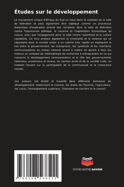 Le mouvement civique d'Afrique du Sud se situe dans le contexte de la lutte de libération et peut également être expliqué comme un processus dialectique d'implication directe des résidents dans la lutte de libération contre l'oppression politique, le racisme et l'exploitation économique de classe, ainsi que l'engagement dans la lutte contre l'apartheid et la culture capitaliste. Ce livre analyse également la criminalité et la violence qui se répandent dans le monde entier à un rythme très rapide en expliquant le lien entre le gouvernement, les entreprises, les syndicats et les chambres communautaires au niveau national visant à mettre en oeuvre à tous les niveaux un contexte de méthodologie de recherche à entreprendre en ce qui concerne le développement communautaire et le rôle des gouvernements nationaux, provinciaux et locaux, du secteur privé et de la société civile, en mettant l'accent sur la participation de la communauté et la croissance sociale.