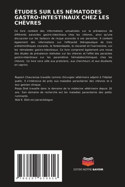 Ce livre contient des informations actualisées sur la prévalence de différents parasites gastro-intestinaux chez les chèvres, ainsi qu'une discussion sur les facteurs de risque associés à ces parasites. Il contient également des informations sur l'efficacité thérapeutique de trois anthelminthiques courants, le fenbendazole, le closantel et l'ivermectine, sur les nématodes gastro-intestinaux. Ce livre comprend également une revue des études de prévalence réalisées sur les chèvres et l'effet des parasites gastro-intestinaux sur les paramètres hématobiochimiques chez les chèvres. Ce livre sera utile aux praticiens, aux chercheurs et aux étudiants en caprins.