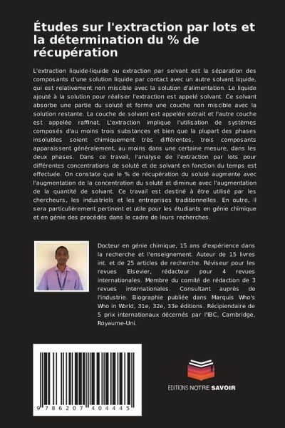 L'extraction liquide-liquide ou extraction par solvant est la séparation des composants d'une solution liquide par contact avec un autre solvant liquide, qui est relativement non miscible avec la solution d'alimentation. Le liquide ajouté à la solution pour réaliser l'extraction est appelé solvant. Ce solvant absorbe une partie du soluté et forme une couche non miscible avec la solution restante. La couche de solvant est appelée extrait et l'autre couche est appelée raffinat. L'extraction implique l'utilisation de systèmes composés d'au moins trois substances et bien que la plupart des phases insolubles soient chimiquement très différentes, trois composants apparaissent généralement, au moins dans une certaine mesure, dans les deux phases. Dans ce travail, l'analyse de l'extraction par lots pour différentes concentrations de soluté et de solvant en fonction du temps est effectuée. On constate que le % de récupération du soluté augmente avec l'augmentation de la concentration du soluté et diminue avec l'augmentation de la quantité de solvant. Ce travail est destiné à être utilisé par les chercheurs, les industriels et les entreprises traditionnelles. En outre, il sera particulièrement pertinent et utile pour les étudiants en génie chimique et en génie des procédés dans le cadre de leurs recherches.