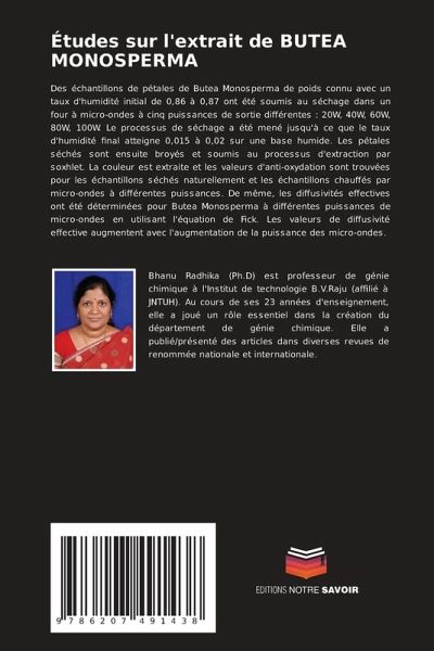 Des échantillons de pétales de Butea Monosperma de poids connu avec un taux d'humidité initial de 0,86 à 0,87 ont été soumis au séchage dans un four à micro-ondes à cinq puissances de sortie différentes : 20W, 40W, 60W, 80W, 100W. Le processus de séchage a été mené jusqu'à ce que le taux d'humidité final atteigne 0,015 à 0,02 sur une base humide. Les pétales séchés sont ensuite broyés et soumis au processus d'extraction par soxhlet. La couleur est extraite et les valeurs d'anti-oxydation sont trouvées pour les échantillons séchés naturellement et les échantillons chauffés par micro-ondes à différentes puissances. De même, les diffusivités effectives ont été déterminées pour Butea Monosperma à différentes puissances de micro-ondes en utilisant l'équation de Fick. Les valeurs de diffusivité effective augmentent avec l'augmentation de la puissance des micro-ondes.